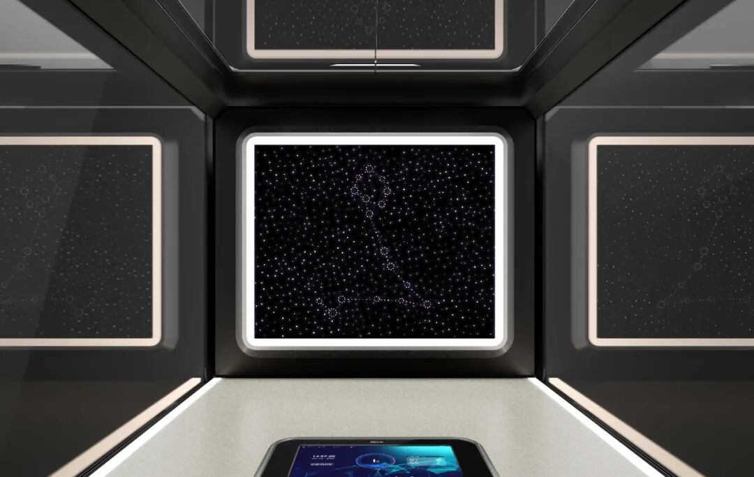 C型平台的顶部可以定制星光天幕,个性化的12星座图案,富丽堂皇的璀璨华庭,为每一段旅程开启梦幻的乘梯体验。