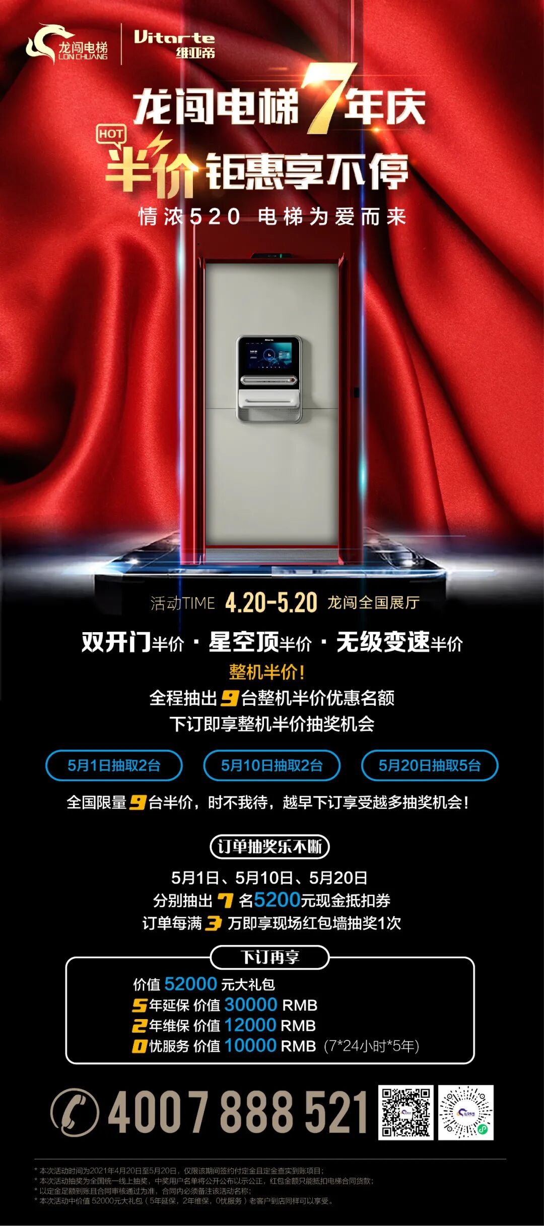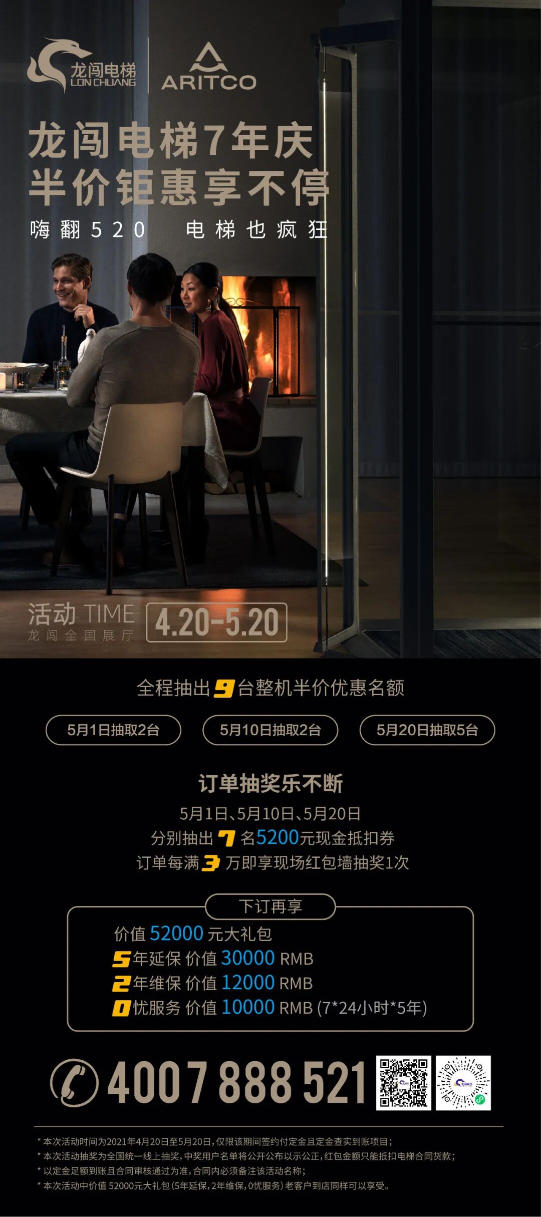 又到了一年中最适合装修的季节,为了回馈广大用户对龙闯电梯的厚爱与支持,让更多中国家庭解锁家用电梯带来的高品质生活。特推出“龙闯电梯7年庆,半价钜惠享不停”活动,想要安装家用电梯的龙粉们千万不要错过年中这次超大力度的回馈活动哦。