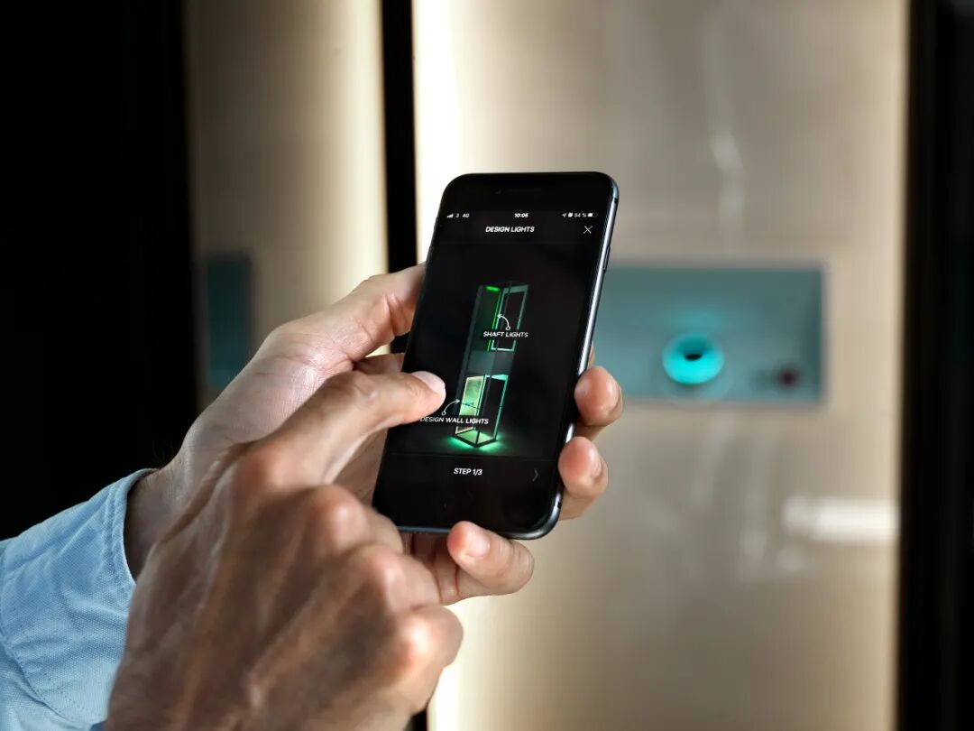 您可以通过智能手机 APP-SmartLift 来变换井道灯带的灯光效果,通过创新的智能控制旋钮 来选层和运行电梯。